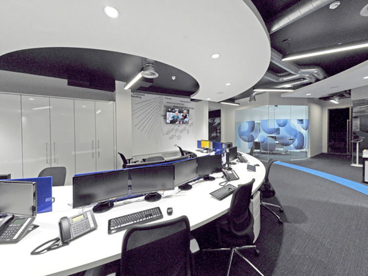 8m and 5m wide concentrically curved desking sections and 2no. 2.8m straight desks finished in Polyrey noir and Polyrey blanc laminate, with blue PVC lined feature cirular access holes and 5mm thick solid blue "743" perspex upstands